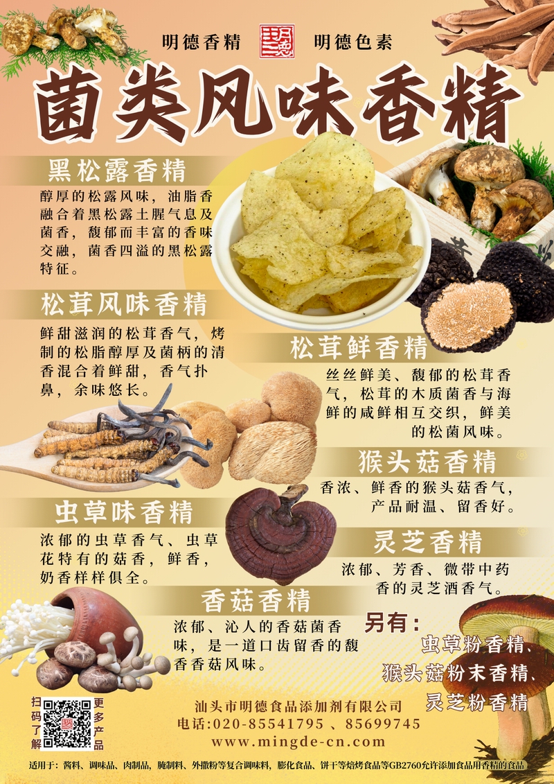 汕頭市明德食品添加劑有限公司的菌類風(fēng)味香精系列,涵蓋黑松露、松茸、蟲草、猴頭菇、靈芝、香菇等多種風(fēng)味,并配有粉末型產(chǎn)品。產(chǎn)品菌香真實、留香持久、層次豐富,適用于湯料包、醬料、調(diào)味品、肉制品、腌制料及外撒粉、復(fù)合調(diào)味料,膨化食品、餅干等焙烤食品等B端應(yīng)用,幫助工廠打造具有辨識度的菌類風(fēng)味產(chǎn)品。